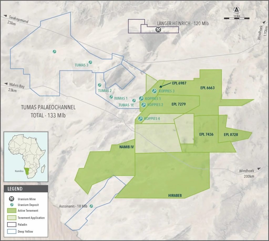The company’s strategy in Namibia focuses on exploring tenements with high potential for surficial uranium mineralisation, with the long-term goal of developing projects to supply uranium for the carbon-free nuclear energy market.